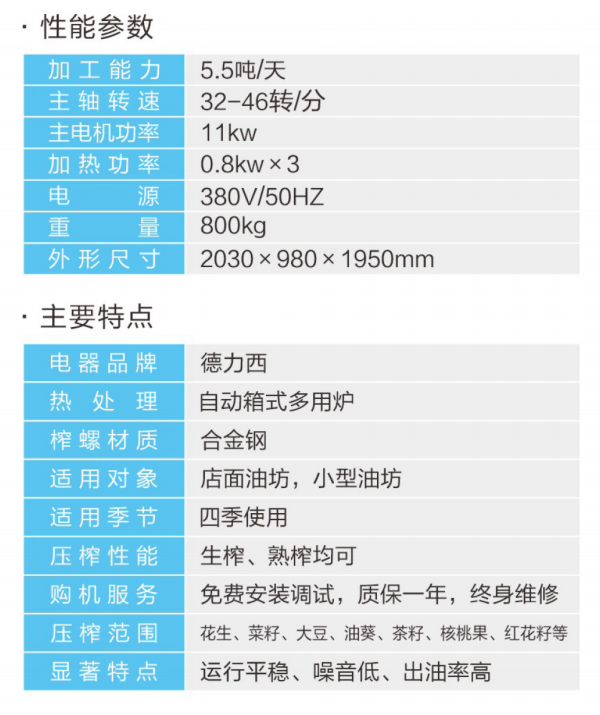 ★壓榨范圍:花生、大豆、菜籽、油葵、茶籽、芝麻等;★適用對(duì)象:店面油坊和微小油坊;★壓榨性能:熱榨一次榨盡,免費(fèi)安裝調(diào)試