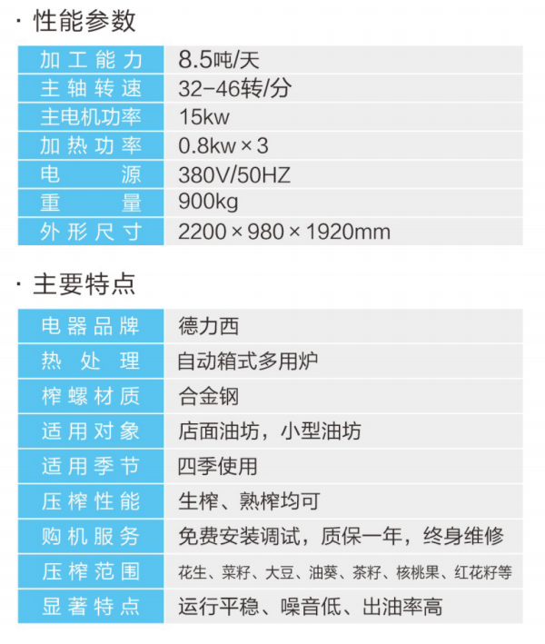 ★壓榨范圍:花生、大豆、菜籽、油葵、茶籽、芝麻等;★適用對象:店面油坊和微小油坊;★壓榨性能:熱榨一次榨盡,免費安裝調(diào)試