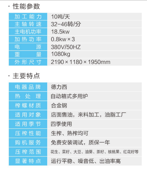 ★壓榨范圍:花生、大豆、菜籽、油葵、茶籽、芝麻等;★適用對象:店面油坊和微小油坊;★壓榨性能:熱榨一次榨盡,免費安裝調試